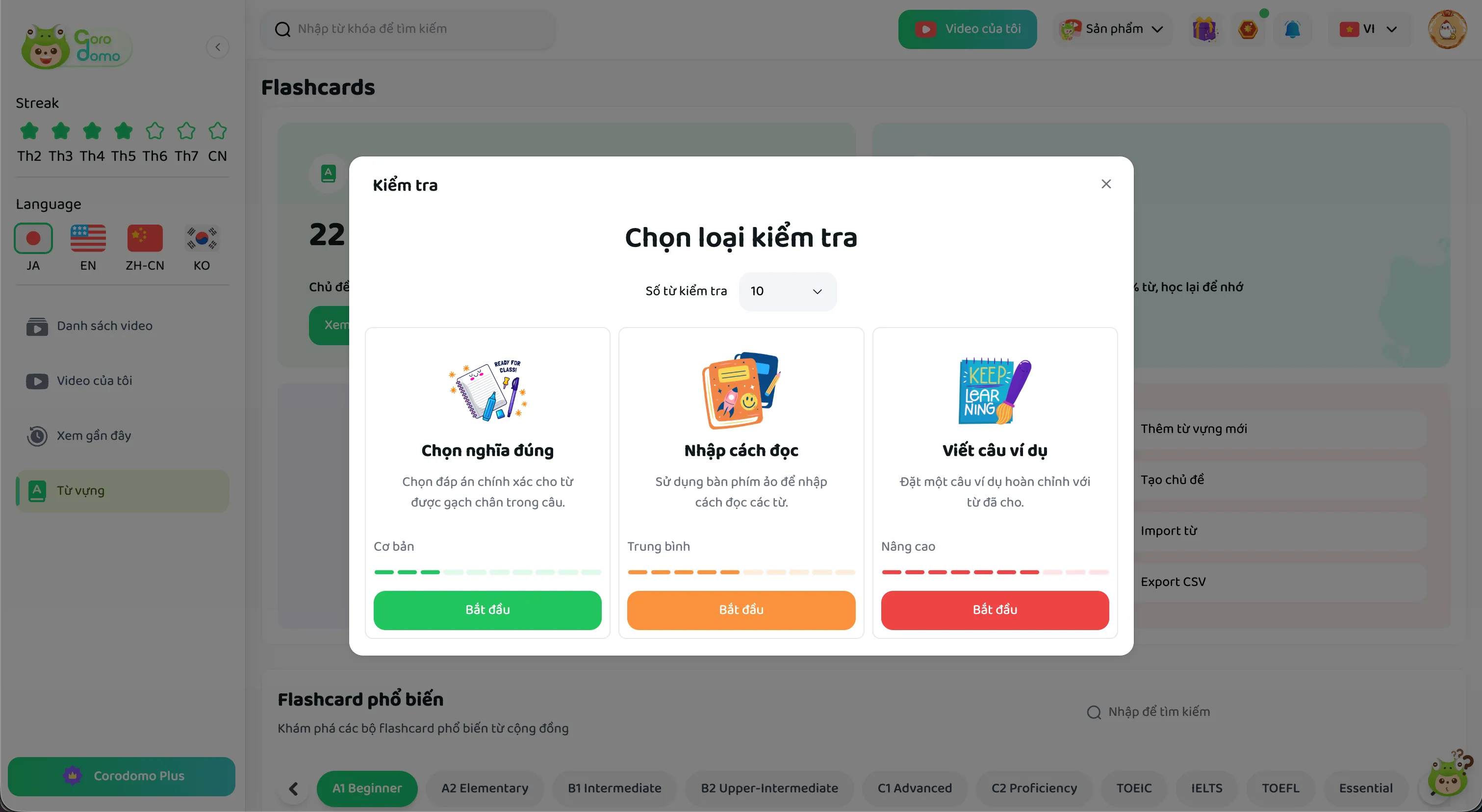 Để đảm bảo việc học từ vựng không nhàm chán và phát huy tối đa hiệu quả, Flashcard mới của Corodomo cung cấp ba chế độ luyện tập chính: