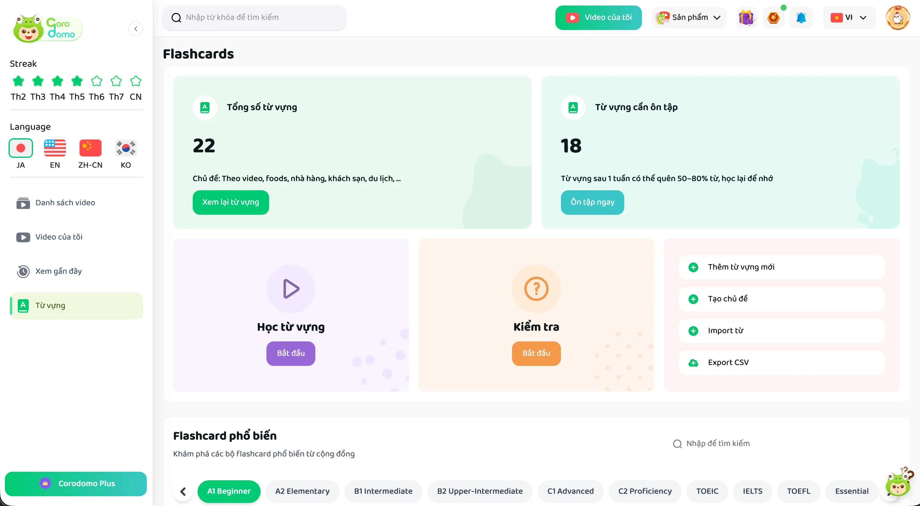 Corodomo cho phép bạn dễ dàng tạo các bộ flashcard theo chủ đề riêng của mình. Dù bạn đang học từ vựng theo video, theo chủ đề ẩm thực, nhà hàng, khách sạn hay du lịch, bạn đều có thể tùy chỉnh và sắp xếp các bộ flashcard một cách linh hoạt, phù hợp với nhu cầu học tập cá nhân.