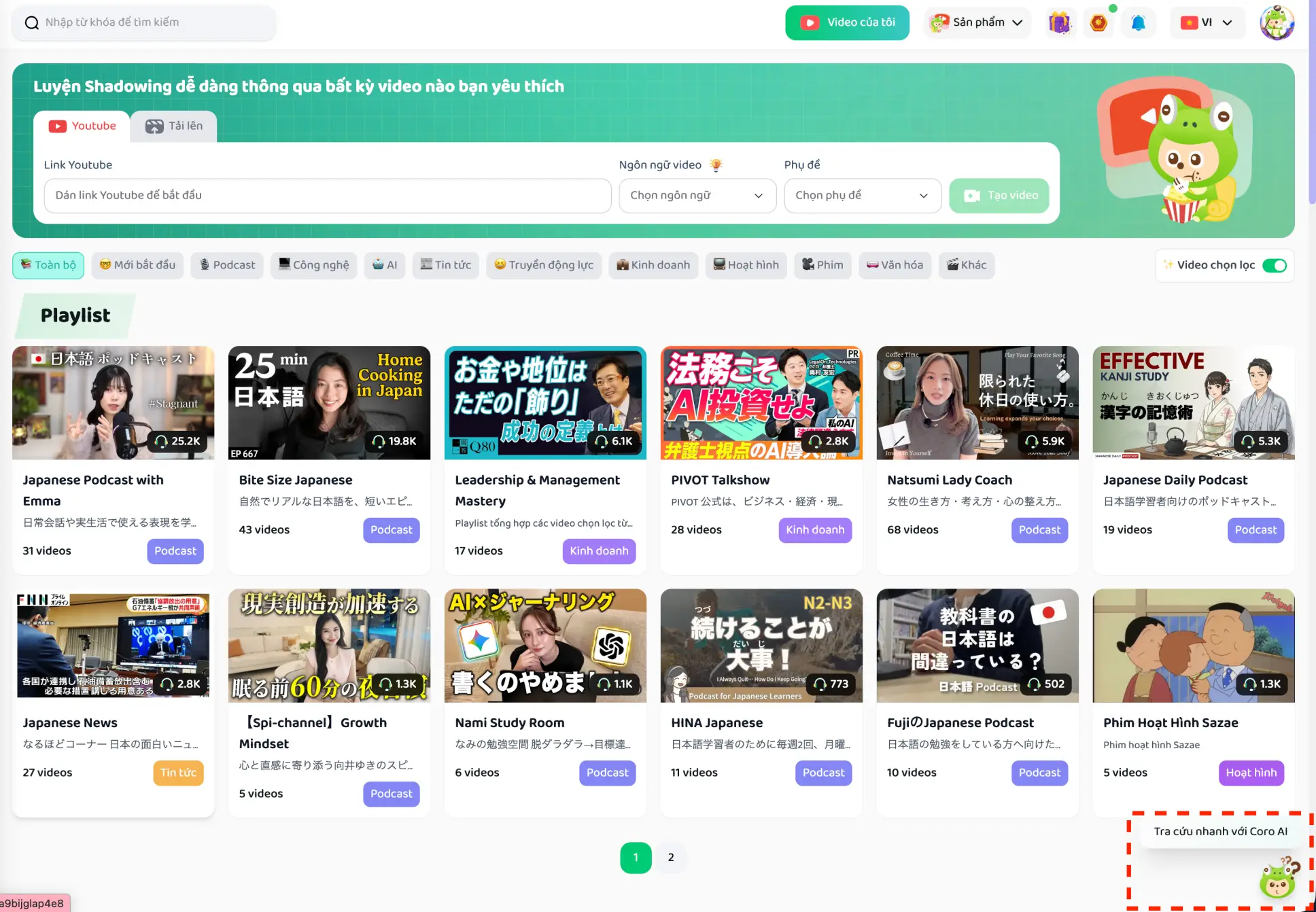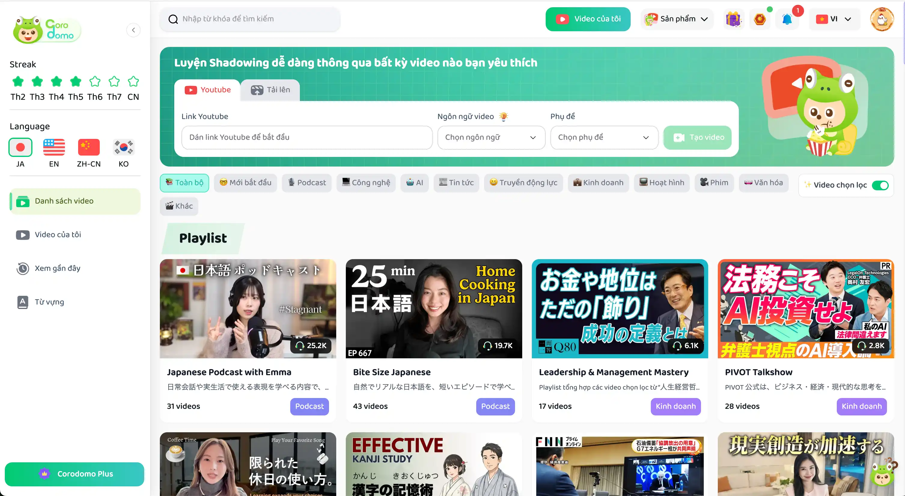 Corodomo là một nền tảng hỗ trợ học ngoại ngữ thông qua video, luyện nói và phương pháp Shadowing.