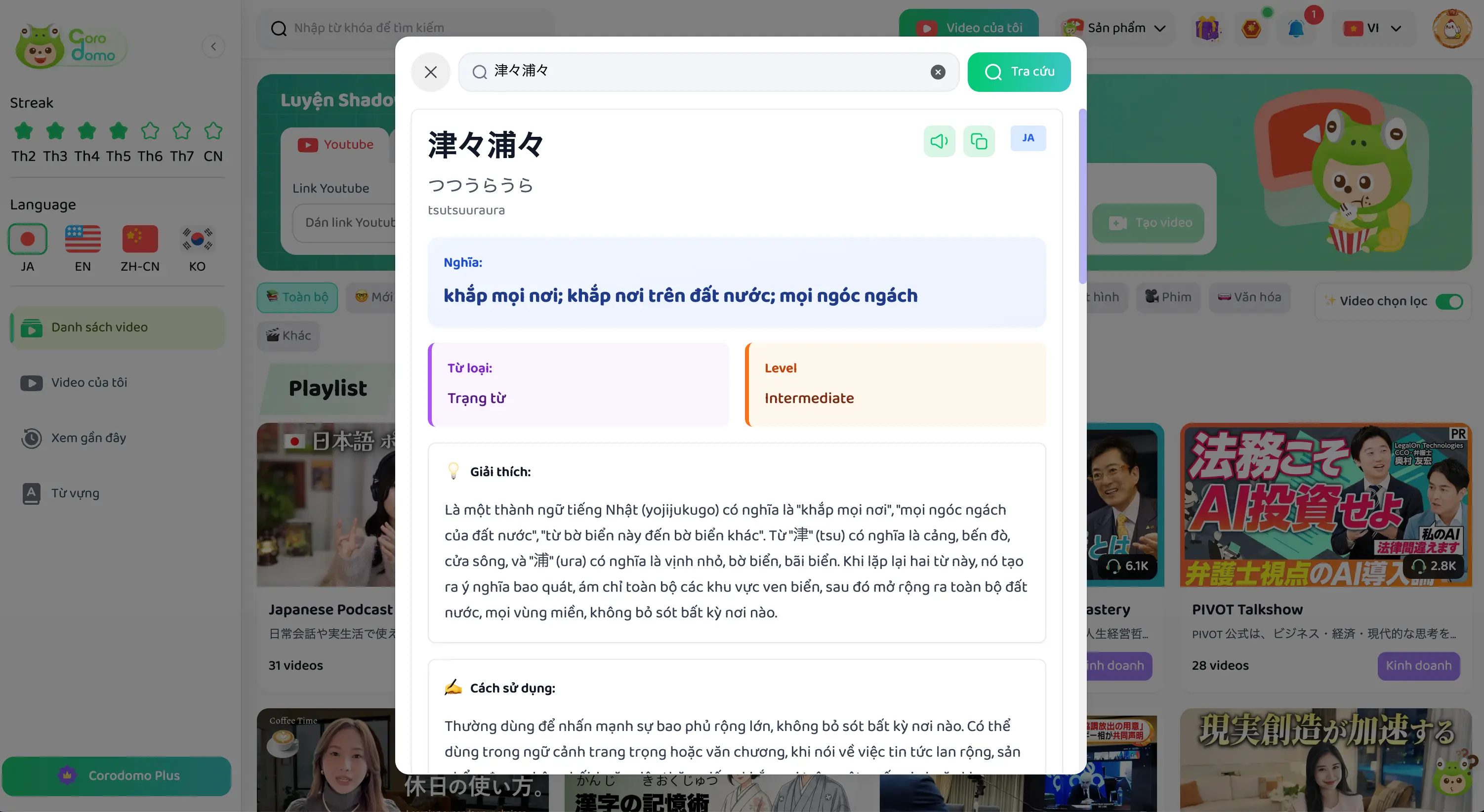 Corodomo sẽ hiển thị thông tin chi tiết của từ vựng, bao gồm: