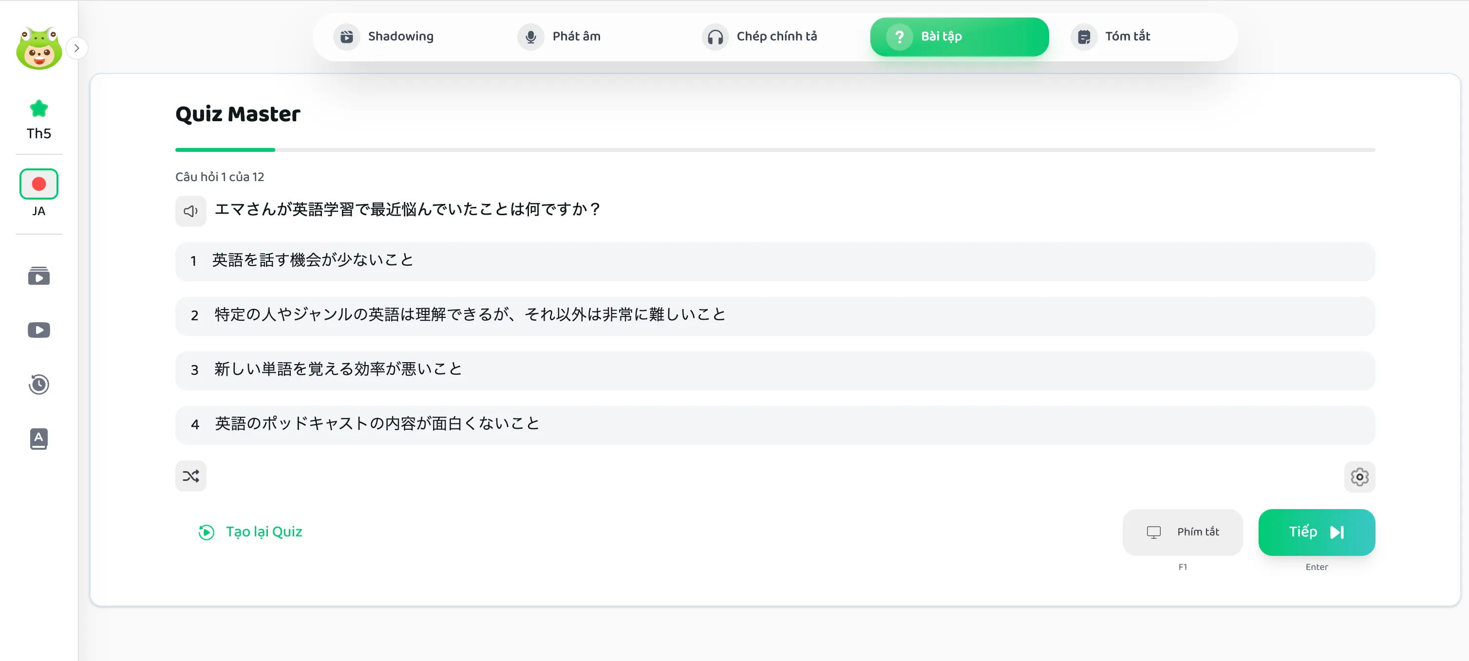 Các câu hỏi được tạo dựa trên nội dung thực tế trong video, giúp người học không chỉ luyện nghe mà còn hiểu sâu nội dung hội thoại.