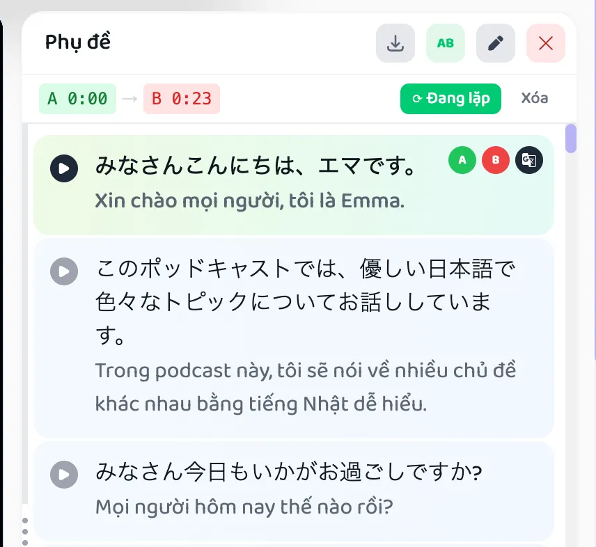 Corodomo cung cấp tính năng Lặp câu A-B giúp bạn luyện Shadowing hiệu quả hơn bằng cách lặp lại một đoạn video hoặc một câu phụ đề nhiều lần.