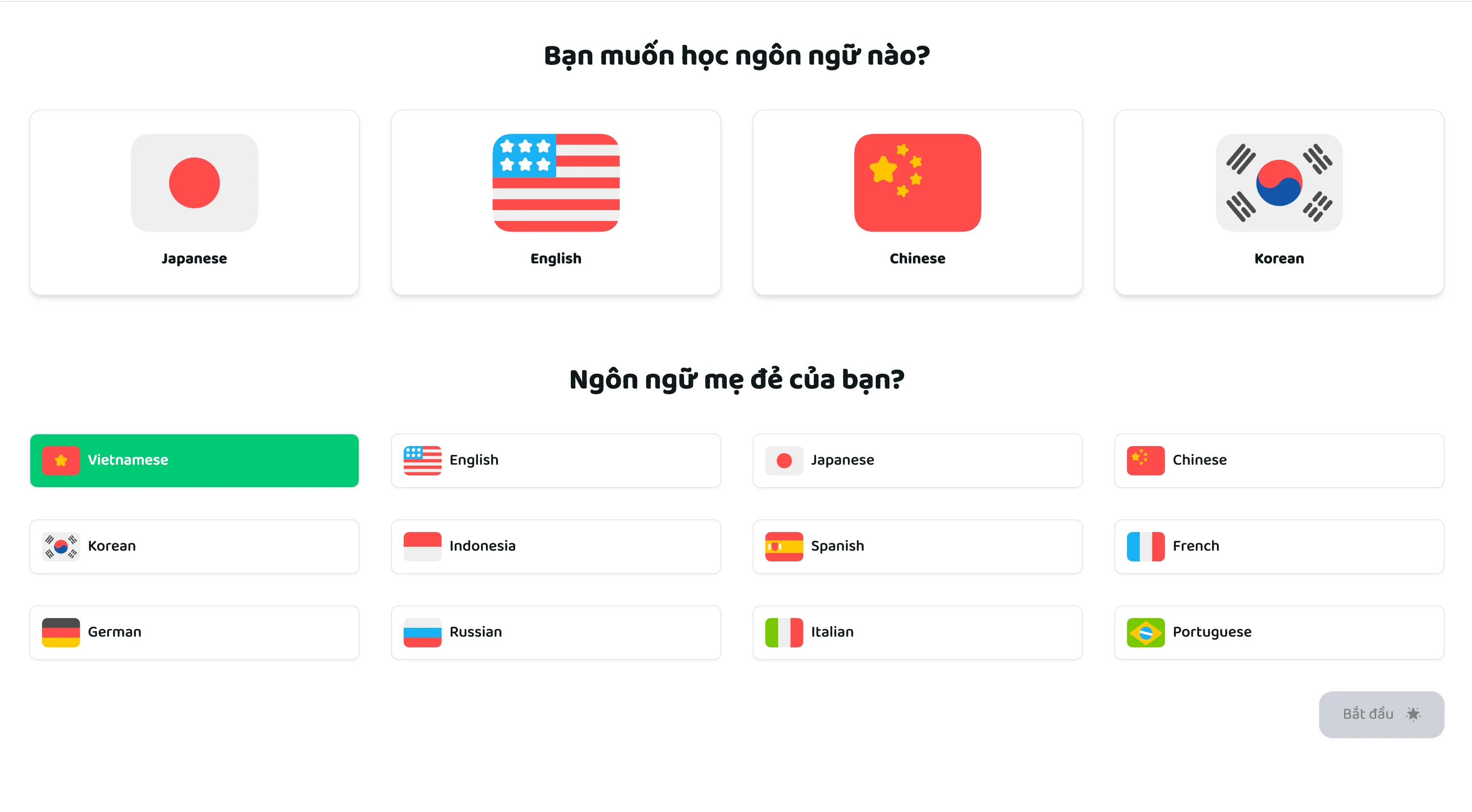 Lần đầu tiên khi truy cập Corodomo, hãy chọn Ngôn ngữ bạn muốn học và Ngôn ngữ bạn nói hằng ngày